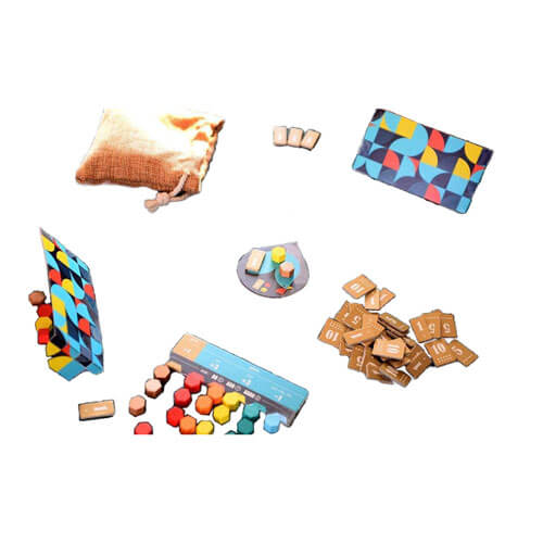 • Includes 80 wooden pieces, 1 cloth bag, 4 dividing screens, 1 Fafnir board, 45 score chips, 1 trash board and game manual.