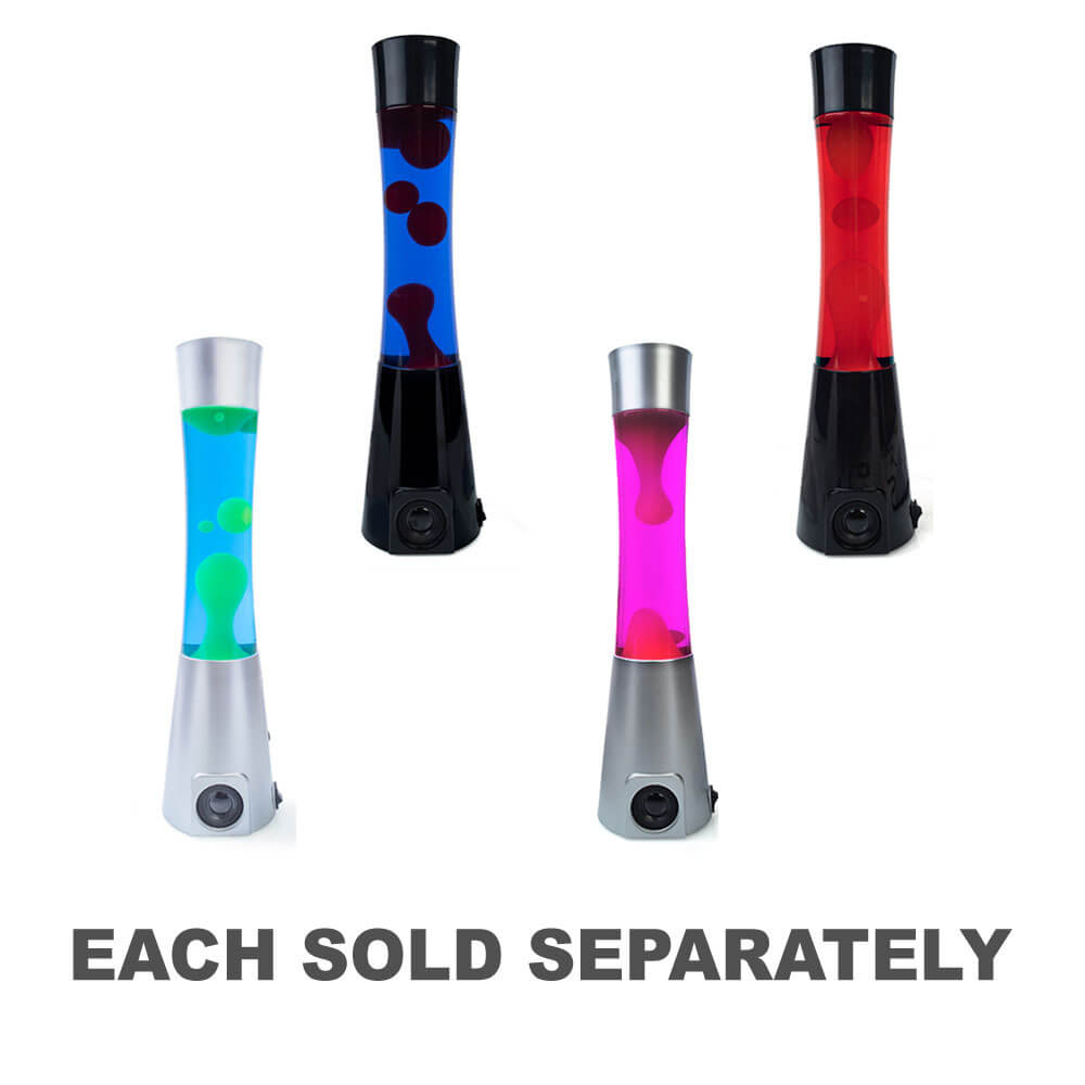 - Features bright red lava floating in purple liquid: with glossy black casing