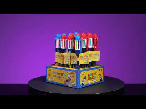 Niveau op din skrivning med denne nyhed Gamer Pen! Funktioner Pixel Icons med tekst, der læser 'Spil over'. Med 6 farver at skrive med: sort, blå, rød, orange, grøn, lilla.