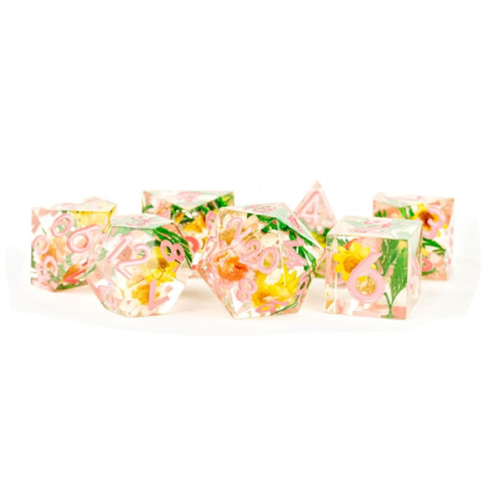 Vores håndlavede, skarpe kantharpiks terninger er håndpoleret for at holde deres smukke skarpe kanter. Disse terninger er tilført med smukke ægte blomster. Fordi disse terninger ikke er tumlet, er de mere præcise end masseproducerede plast terninger. Det er svært at slå værdien i vores harpiks terningsæt. Smuk og overkommelig, dette er store "kritiske forstærkere" til vores metal terning. Hvert 16 mm polyhedralsæt leveres med 7 terninger (D4, D6, D8, D10, D10 (00-90), D12 og D20).