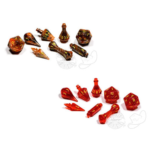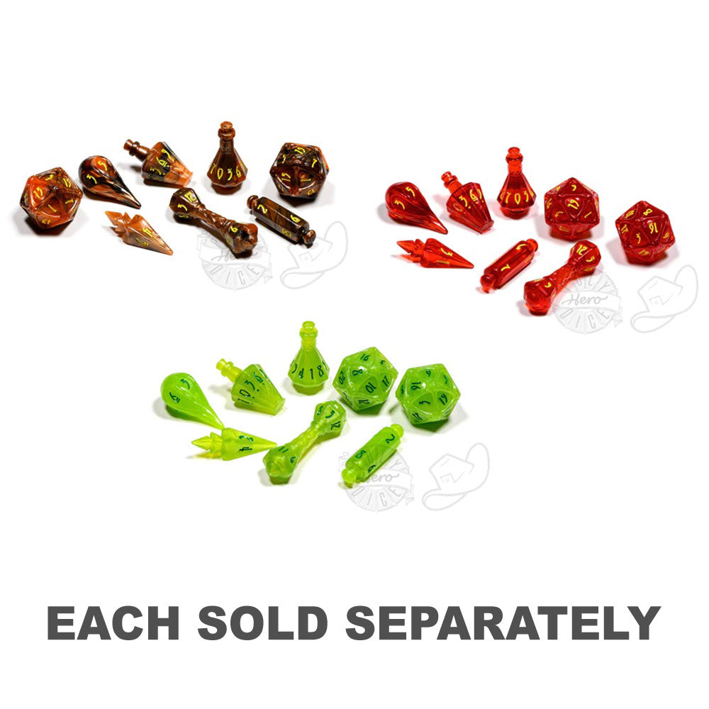 Only the bravest minds ponder the mysteries of the arcane. Cast forth a synthesis of custom dice for your favorite RPGs that will hold a respected place in your collection. Each PolyHero Wizard 8 Dice Set comes with 8 dice: D4 Bolt, D6 Fireball, D8 Scroll, 2 D10 Potions, D12 Wand, and 2 D20 Orbs