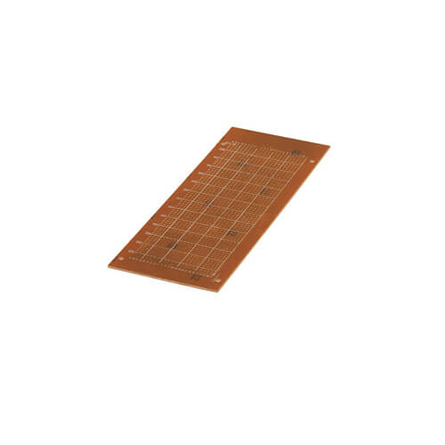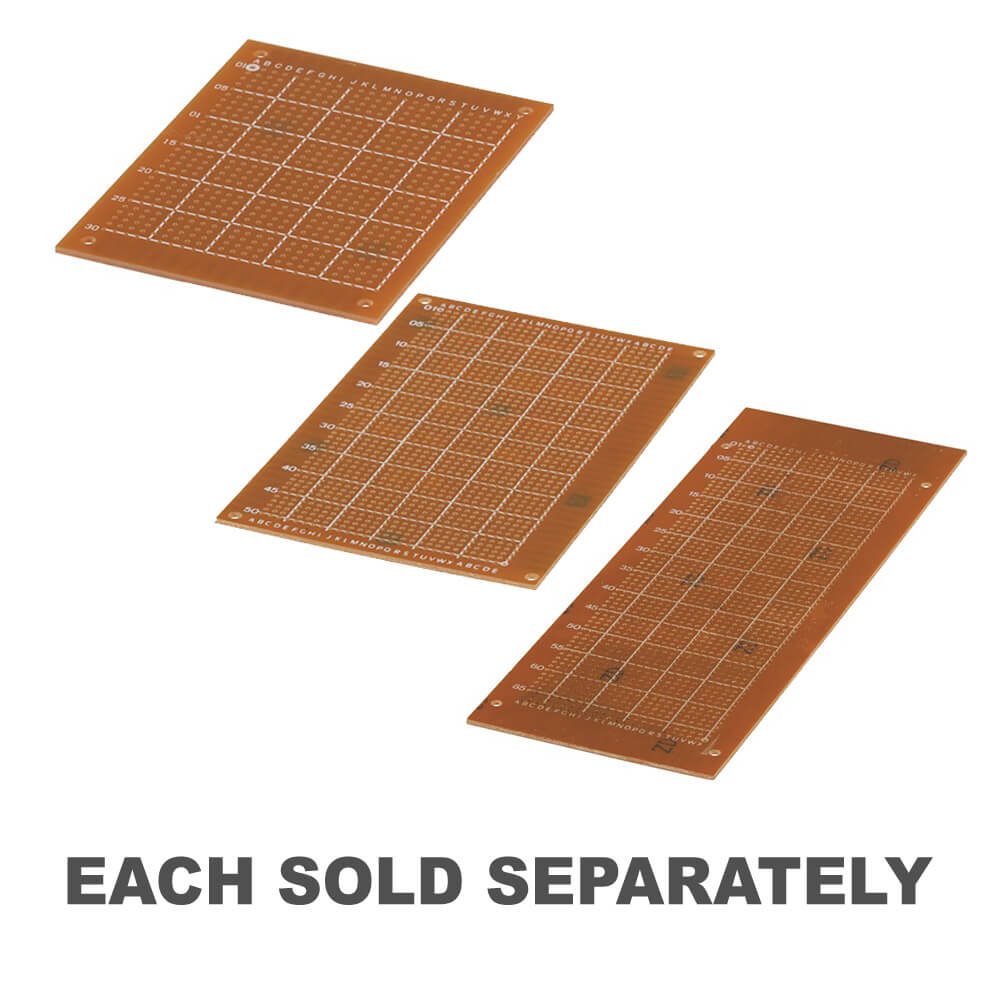 Die kostengünstige Möglichkeit, Prototypen zu bauen. Jeder Donut ist von seinen Nachbarn durch einen Abstand von etwa 0,5 mm getrennt. Dies isoliert effektiv jedes Pad, erleichtert aber auch die Überbrückung von Lötstellen, um Verbindungen herzustellen. Jede Platine verfügt außerdem über „Finger“ an gegenüberliegenden Enden mit einem Kantenabstand von 3,6 mm. Diese können für den Anschluss an und von der Platine oder an einen Kartenrandanschluss verwendet werden. Schließlich ist auf der nicht lötbaren Seite der Platine ein alphanumerisches Raster aufgedruckt, das bei der Bauteilidentifizierung des Platinenlayouts hilft.