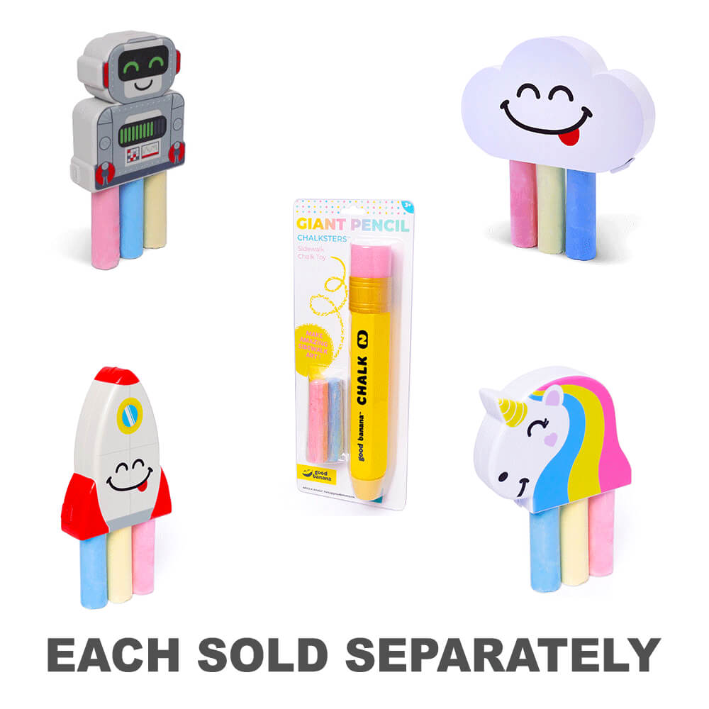 Chalksters Pencil, unlock your child's creativity by making drawing with bulky sidewalk chalk effortless! It's clever design holds their chalk with a comfortable and secure grip. Even better, children can draw with up to three sticks of chalk (included!) at one time for amazing sidewalk art. Chalksters grip your chalk one of two ways-the footlong pencil holds one piece of sidewalk chalk for extra-large ideas, twisting to lock the chalk in place. Swap colors in seconds and create a modern masterpiece! Go ahead and load one up and pull it across the pavement to see them light up with a smile.