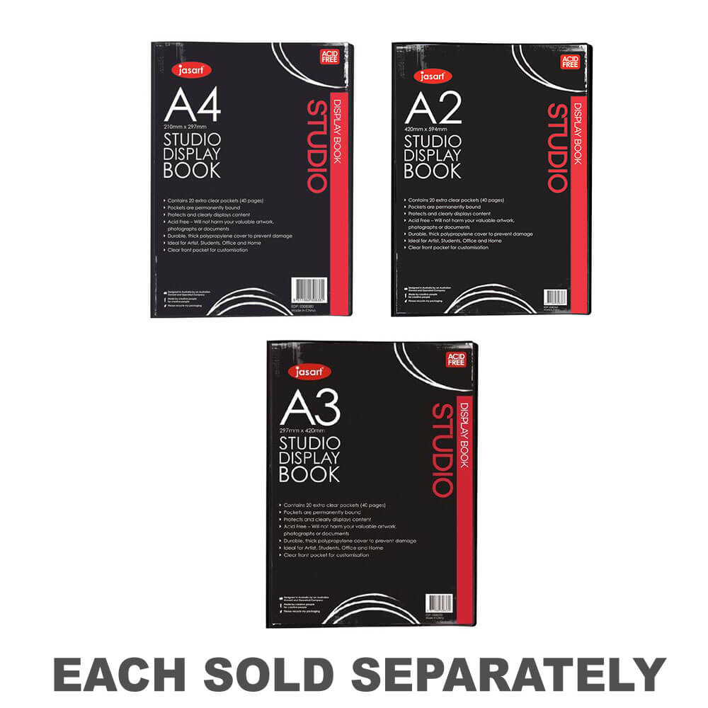 The jasart studio display books protect and clearly display contents. Use the front cover pocket to display labels, title pages and pictures to personalise your display book. Features: pages are permanently bound for durability.