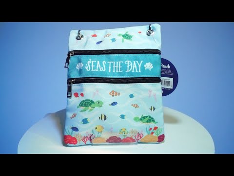• With 2 secure zippered pockets, 1 slip pocket on the back, & an adjustable aqua strap.
