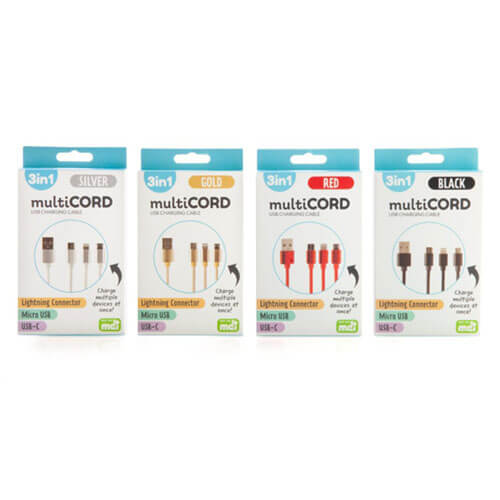 Multi-functional charging cord with 3 different connector types.