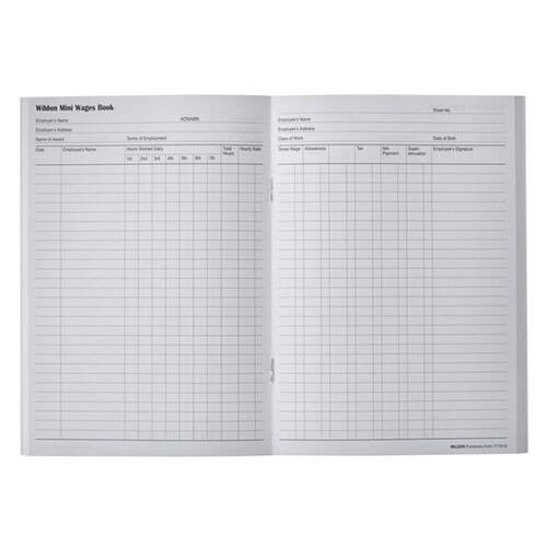 This Wildon 171W Mini Wages Book is an easy and efficient way to record hourly rates and working hours over a 7 day working week. This book is pre-printed so all you have to do is fill in your details. This book includes sections for names, award, DOB, rate, hours, tax, allowances, superannuation and more.