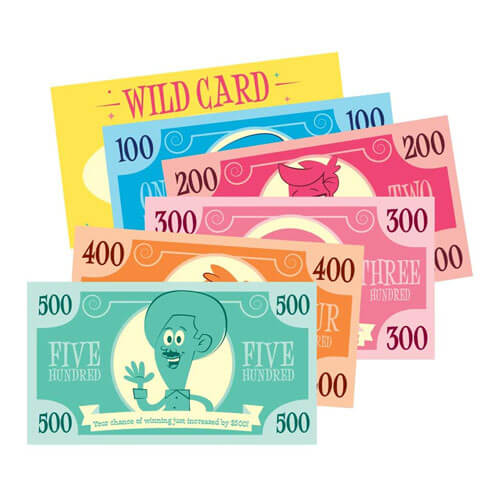 • ¿CÓMO SE JUEGA? - En cada turno, el jugador 1 lee en voz alta una de las 180 preguntas divertidas, creativas, personales y "cargadas". Todos los demás escriben una respuesta personal a la pregunta en su hoja de respuestas. ¡Cualquier respuesta servirá! El jugador a la derecha del Jugador 1 recopila, mezcla y lee las respuestas en voz alta. El jugador uno elige su respuesta favorita y tiene que adivinar qué jugador dijo qué respuesta. El jugador 1 recoge una tarjeta de dinero por cada coincidencia correcta. El jugador que escribió la respuesta favorita también elige una tarjeta de dinero. Cada tarjeta de dinero tiene un valor en dólares de $100 a $500 y se mezclan comodines