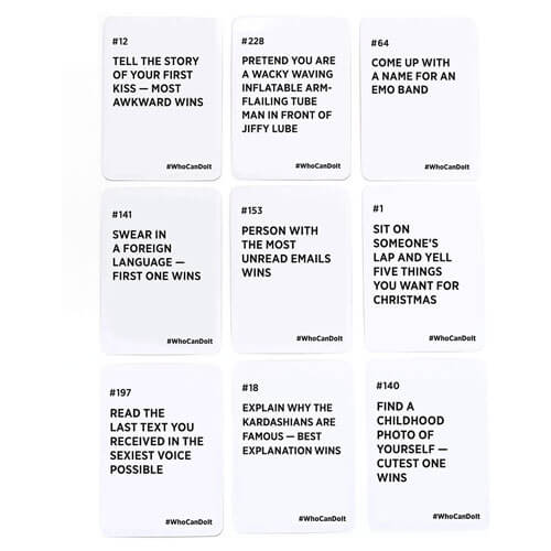 Chi può farlo ... include 250 carte d'azione per vedere chi nel gruppo può farlo! Competi contro i tuoi amici per fare la migliore impressione del giudice, bere un bicchiere d'acqua con un cucchiaio e cambiare lo sfondo del telefono in una foto di un uomo calvo.
