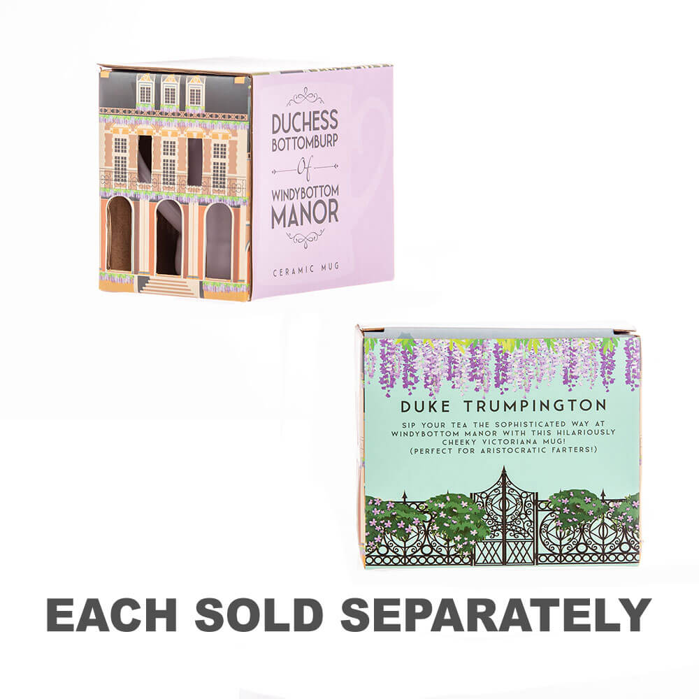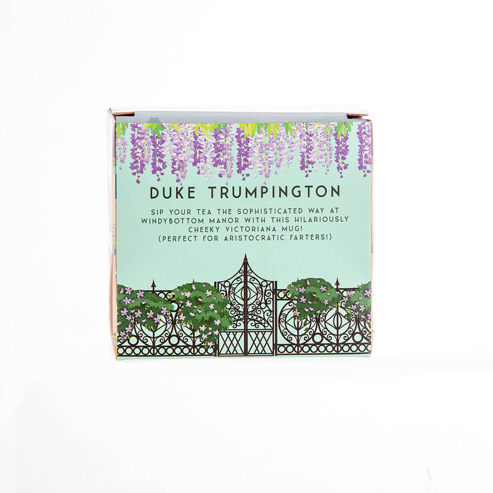 みんなおなら - 公爵や公爵夫人でさえ!この陽気な斬新な「デューク・トランピントン」ビクトリアナ・マグカップには、「ウィンディボトムマナーのデューク・トランピントン」が楽しいテキストで完成しています。ゴージャスな青いマグカップに印刷され、高品質のグラフィック装飾的なギフトボックスに表示されたこの楽しい引用マグカップは、誕生日やクリスマスに彼にとって完璧なギフトであり、トランピントンの家に公式に紹介します(当然のことです)!