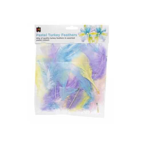 さまざまなパステルターキーフェザーパックは、コラージュ、カード製造、衣装、マスクの装飾、ヘッドデレスなど、多くのクラフト用途に最適です。 60gパックのパステルカラー。