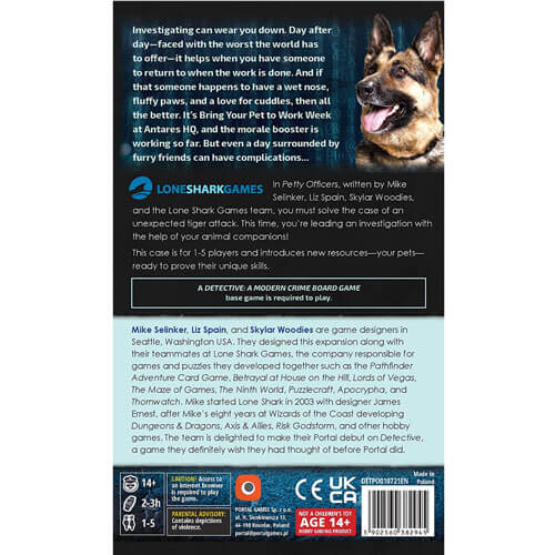 Noen ganger trenger alle en pause, til og med spesielle agenter. De kommer hjem med et desperat behov for en klem. Spesielt hvis det er en klem fra noen hårete, med en fuktig nese og en surrende hale. Men klemmer er ikke deres eneste spesialitet. De kan også løse en kriminell etterforskning ... Petty Officers er en utvidelse til det legendariske kriminalitetsspillets detektiv av Ignacy Trzewiczek. Utvidelsen ble skrevet av den berømte Mike Selinker, sammen med Liz Spania, Skylar Woodies og Lone Shark Games -teamet. Men denne gangen blir kjæledyr med på Antares -etterforskningsteamet!
