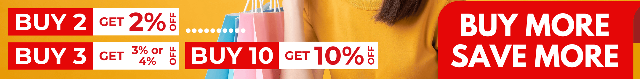 Säästä lisää jokaisella ostolla! Hanki 2% alennusta jokaisesta ostamastasi lisätuotteesta (jopa 10%: n alennus 6 tuotteesta ja enemmän) tai nauti 1%: n alennuksesta jokaisesta ostamastasi lisätuotteesta (jopa 10%: n alennus 10 tuotteesta ja enemmän). Mitä enemmän ostat, sitä enemmän säästät!