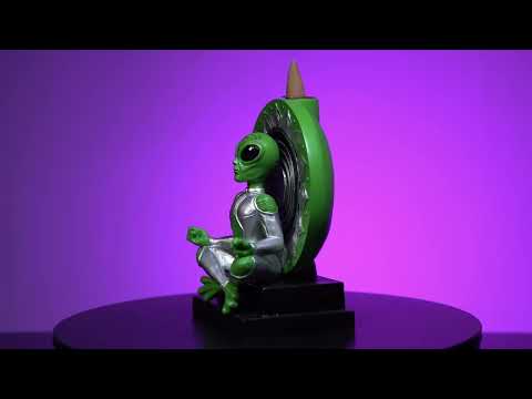 Backflow Burner z dziwacznym hipisowym projektem obcych. Alien nosi niebieską i fioletową nakładkę zawierającą złoty symbol pokoju. Pachnące dym płynie w dół i z ust obcego na żywy kwiat, gdy na wierzchu umieszcza się oświetlony stożek kadzidełkowy. Nadaje się do szyszek kadzidełkowych.