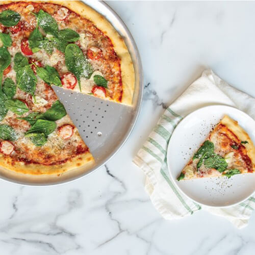 Istnieje powód, dla którego restauracje serwują pizzę na patelniach takich: aluminium jest najlepszym materiałem do nawet ogrzewania i działa jak tarcza, aby zapobiec spalaniu. Airflow stworzone przez małe dziury tej patelni zapewnia doskonale chrupiące skorupy. Nubby stopy zapewniają stabilność cięcia.