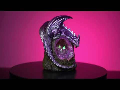 Magical Back Flow Burner z metalicznym fioletowym smokiem zwinął się wokół pnia drzewa. Migling Geode otacza trzy widoczne kryształy. Szczegółowe rzeźbienie i kolor. Zmieniające się diody LED sprawiają, że ten palnik jest pięknym funkcjonalnym ornamentem.