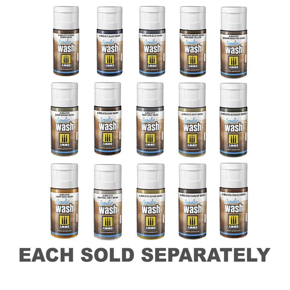 Washes are one of the oldest and most essential modelling techniques, used by all modellers on subjects and dioramas of all types and themes. Developed with two different formulations to include both enamel type and acrylic type. Each type features different qualities to adapt to the variety of needs of our models and the preferences of each modeler demand. Both offer excellent results and are very easy to apply. The advantage of the acrylic wash is that it has no toxicity or odour so using it at home or near your family is not a problem, and it dries faster than the enamel wash which allows you to finish the process in a shorter amount of valued time. The acrylic wash comes in a bottle with a dosing cap that allows you to place a few drops on a palette or container for later use. Although the capacity of the bottle is 15 mL, the dispenser allows you to save product and work with more precision