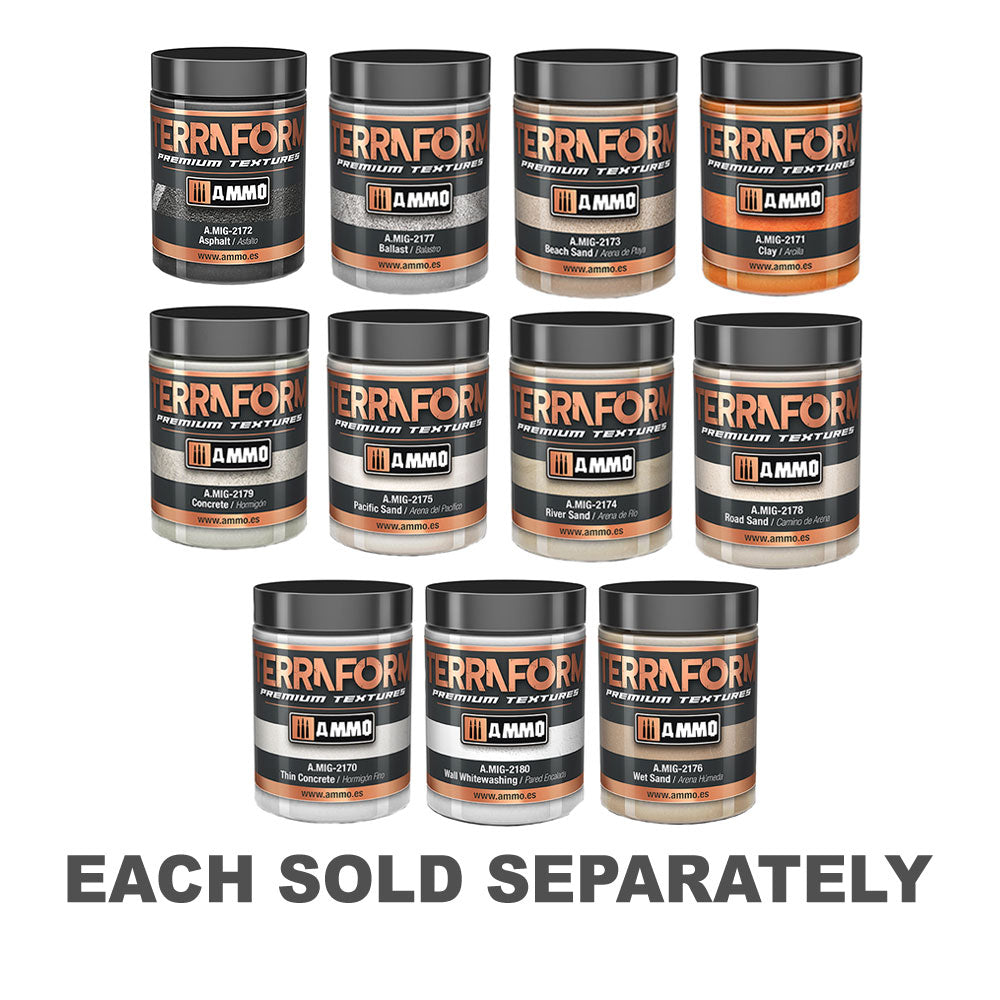 With this new acrylic formulation made with natural minerals, enabled you to authentically recreate a wide variety of textures, such as concrete, sand, asphalt, clay and ballast. This product, acrylic, non-toxic and odourless, is presented in 100 mL canisters. It dries completely within 24 hours and can be mixed with other similar products from our range of textures. It is suitable for any scale from 1/16 to 1/48.