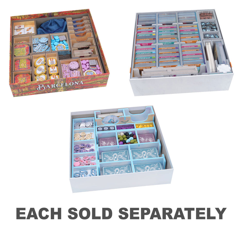 Insert compatible with Barcelona®, including the Passeig de Gràcia® expansion. The design provides both efficient storage and improved game play. Many of the trays can be utilised during the game, and they greatly aid set-up and clear-away times. The rules and boards act as a lid on top of the trays