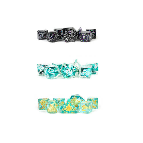 MDG resin dice have unique inclusions that add flare to any gaming table. These are full-sized 16mm polyhedral dice sets that come with 7 dice (d4, d6, d8, d10, d10%(00-90), d12, and d20).