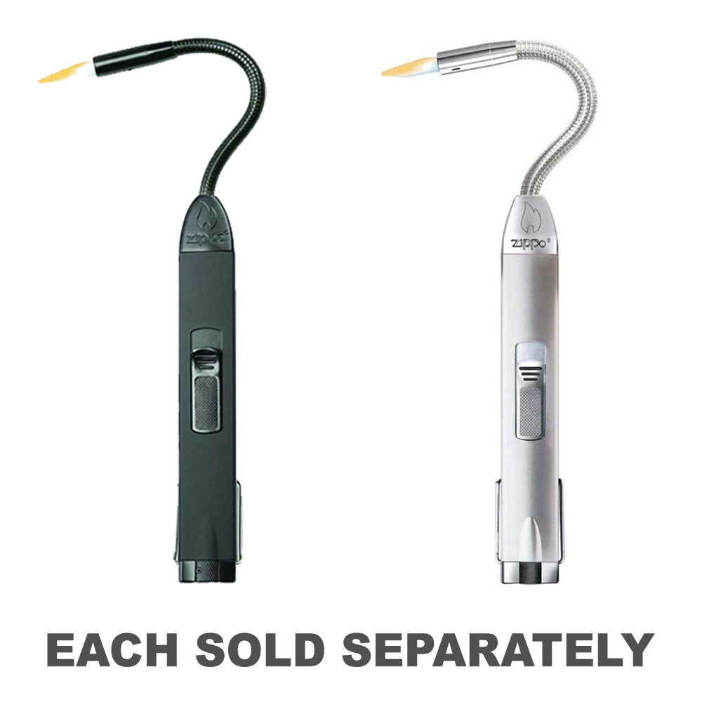 Zippo Flexible Neck Outdoor Utility Lighter is flat black aluminum construction with rubberized inserts. Wind-resistant dual flame technology. Flexible extended neck, topped by a slim, powerful nozzle, easily fits all lighting openings. Advanced ignition system. Fuel-level indicator. Adjustable flame patented child-resistant safety button. Stainless hanging loop. Ideal for camping, lanterns, fireplaces, tiki torches, grills, campfires and more. The standard case shape featuring rounded corners and top with a flat bottom. A five-barrel hinge joins the top and the bottom. It has a standard insert with 16 holes in the chimney (8 per side). The bottom is stamped with Zippo logo from the period authenticates these lighters as genuine Zippo.
