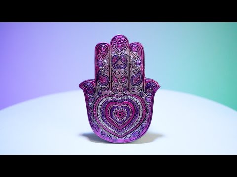 Queimador de incenso em forma de Hamsa, com intrincados design de coração e paisley com um acabamento roxo metálico.