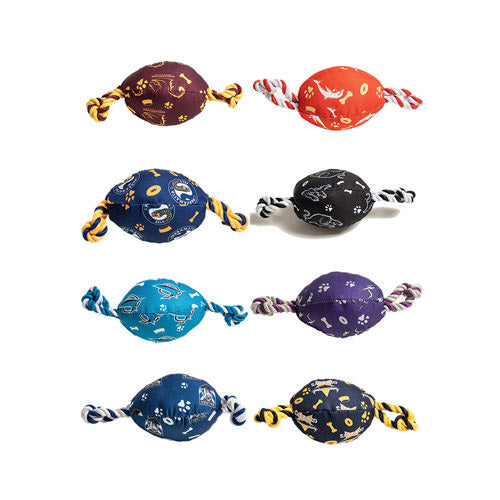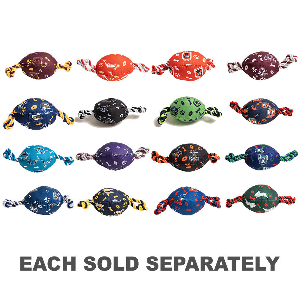 Introducing the NRL Chew Toy a durable, officially licensed product featuring soft polyester filling, a built-in squeaker, vibrant team colors, and a strengthened canvas exterior with a chewing rope, providing hours of fun for your furry friend while showcasing your team pride!