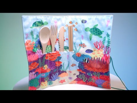 - Miljövänligt bestickuppsättning tillverkat av bambu, med en resefolie som fungerar som en placemat.